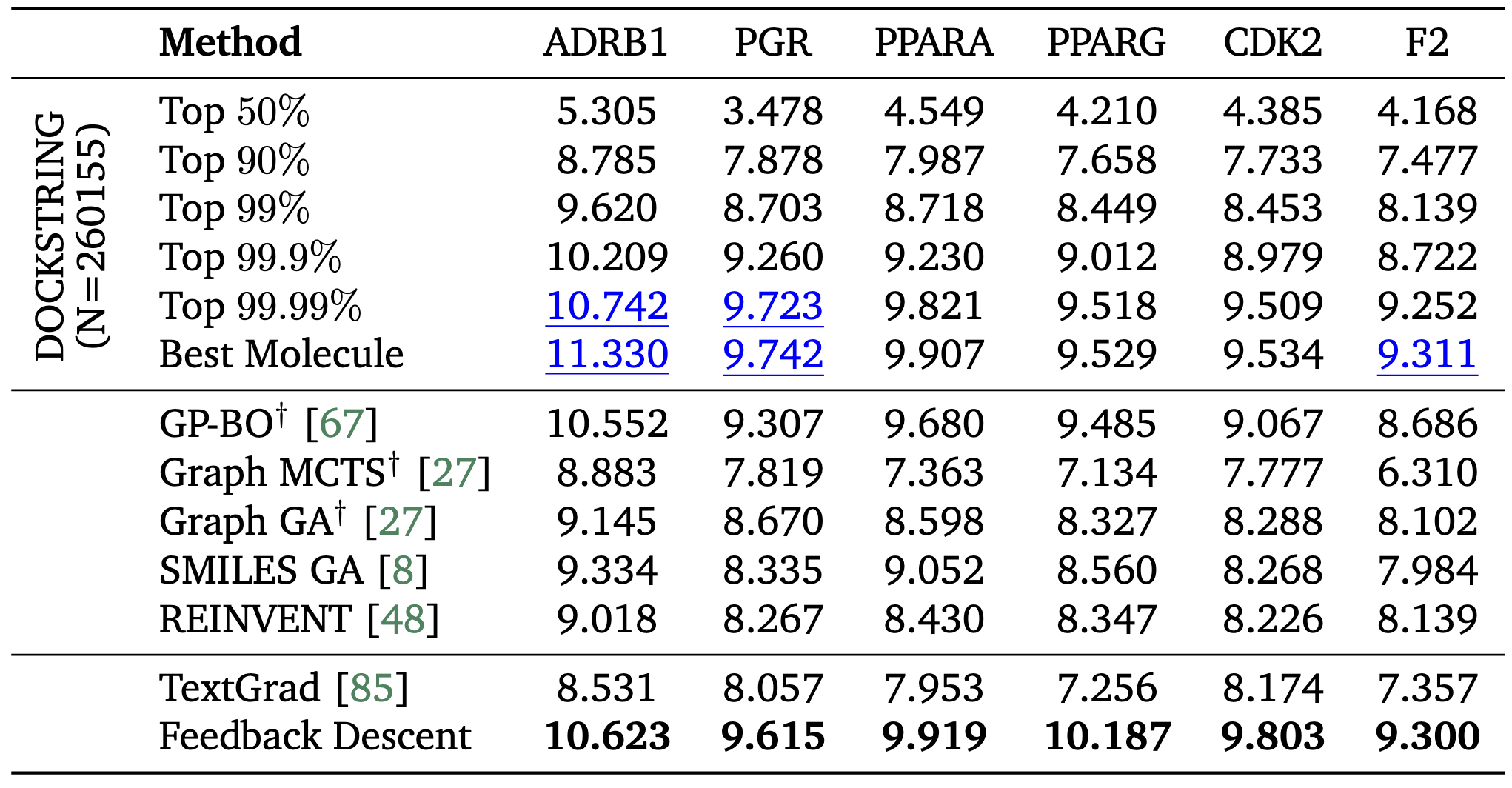 Molecular Design. We compared Feedback Descent with specialized graph-based molecular optimizers that explicitly encode chemical structures, as well as REINVENT, a reinforcement learning method specifically designed for molecular optimization. Feedback Descent, operating purely on text representations (SMILES strings), matched or exceeded these specialized methods. On multiple targets, our text-based approach identified molecules surpassing the 99.9th percentile of DOCKSTRING’s 260,000-compound database. In several cases, we matched or exceeded the best molecule in the entire database. In this domain, Feedback Descent achieved an average 3.8x reduction in docking calls relative to reinforcement learning (REINVENT).