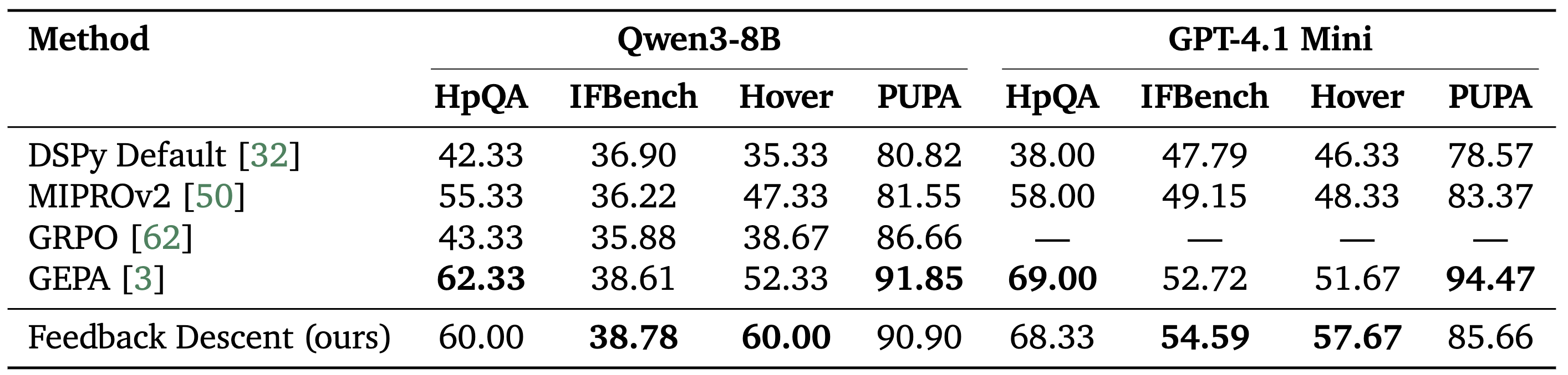 Prompt Optimization. On four diverse tasks (multi-hop reasoning, instruction following, privacy-aware delegation, and retrieval verification), Feedback Descent achieved competitive performance with GEPA, the state-of-the-art prompt optimization method, while outperforming GRPO, a reinforcement learning baseline.