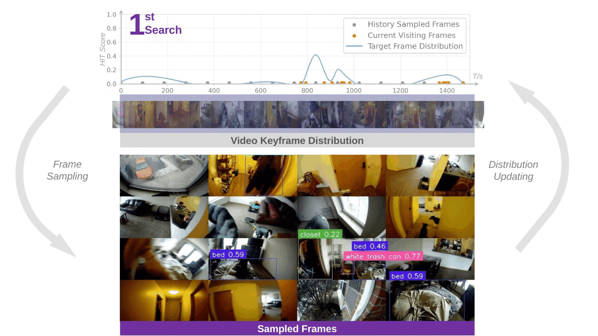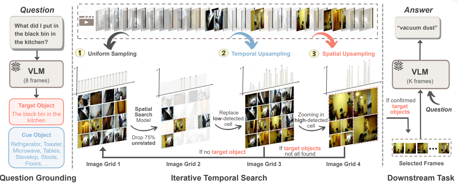 Ground the question. We first sample a handful of frames uniformly. A VLM reads the question and lists (a) the target we must find (e.g., “the black bin in the kitchen”) and (b) useful cues (e.g., “fridge, counter, stools”). These become anchors for search.