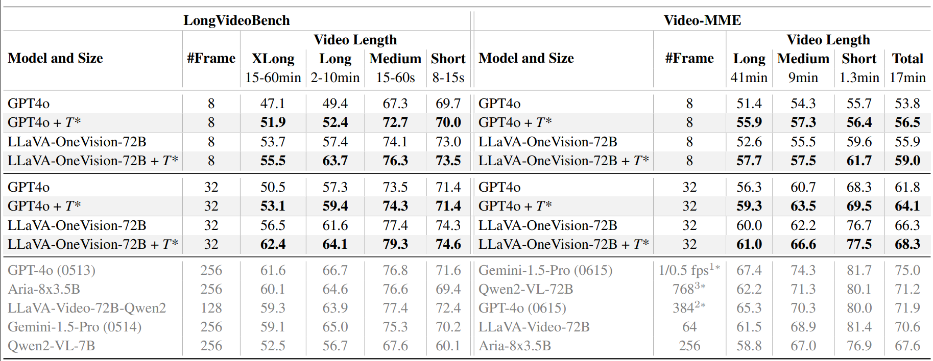 - LongVideoBench XL: T* improved GPT-4o’s accuracy from 47.1% → 51.9% using only 8 frames, beating uniform sampling baseline with 32 frames.