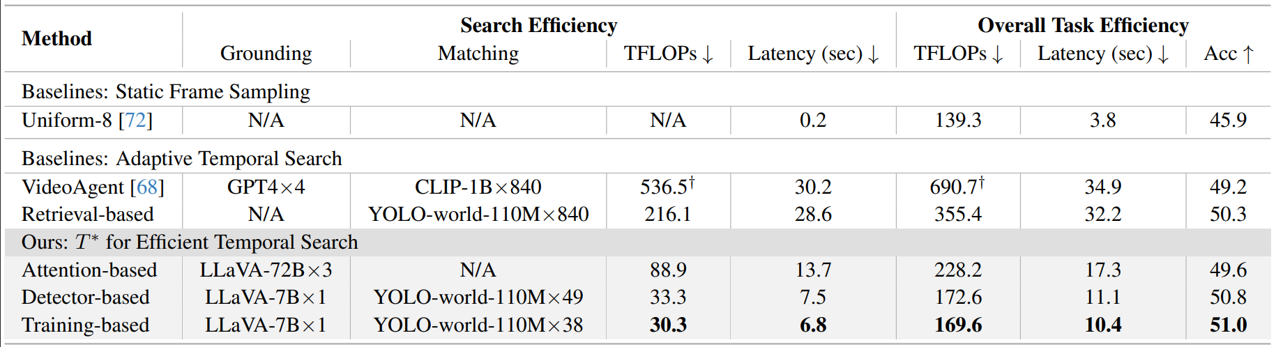 Why it’s efficient. Instead of scanning every frame, T* quickly narrows down when to look by scoring a grid, dropping most cells, and zooming into just a few short segments. You get targeted reasoning with very few frames and minimal compute—as low as 30 TFLOPs for temporal search compared to baseline’s 90–200 TFLOPs. Furthermore, T* leverages efficient, off-the-shelf detectors for temporal-spatial search, making it training-free.