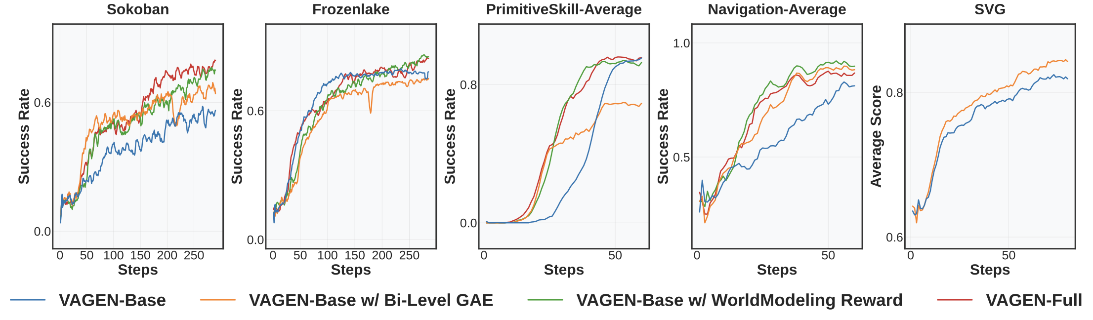 - VAGEN-Full (both): Most robust, achieving strong and stable results across all tasks
