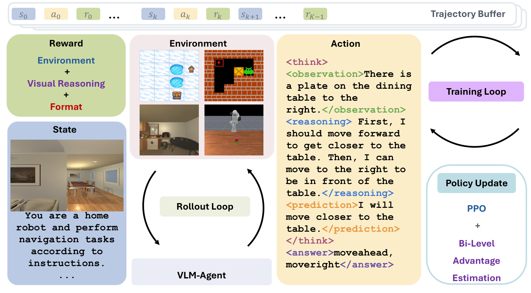 Rollout Phase: The VLM agent interacts with diverse visual environments through multi-turn episodes. At each turn, the agent receives a visual observation, generates structured reasoning and actions, and receives environment feedback. Complete trajectories are collected in a trajectory buffer.
