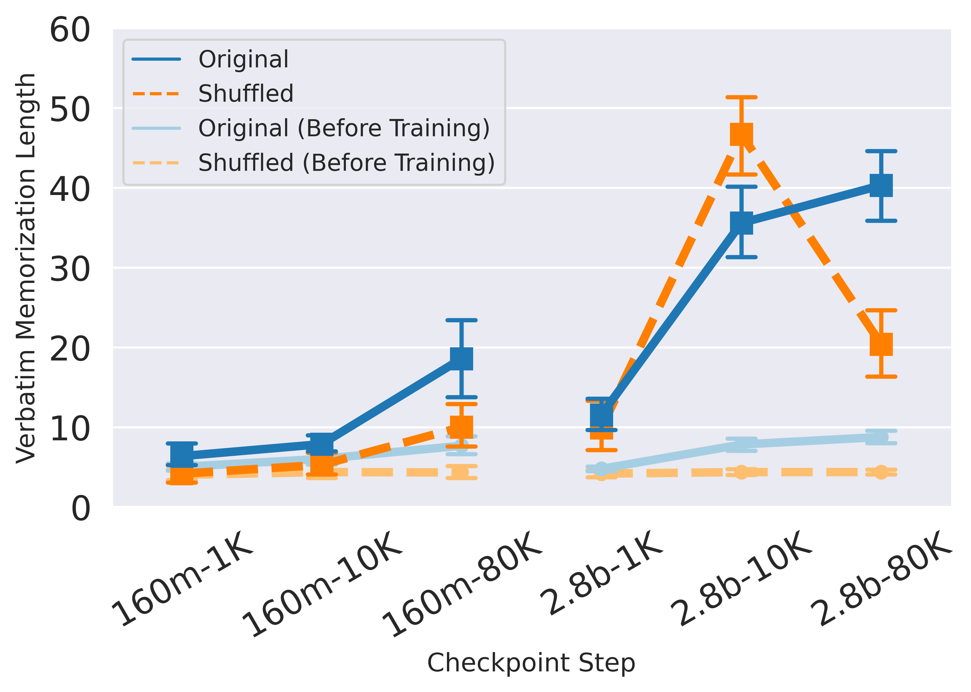 - Sequences without structures are harder to memorize: Sequences with tokens randomly shuffled are harder to be verbatim memorized by the later checkpoints where the model has fully acquired the syntactic structures, as shown in Figure 3 dotted orange curves.