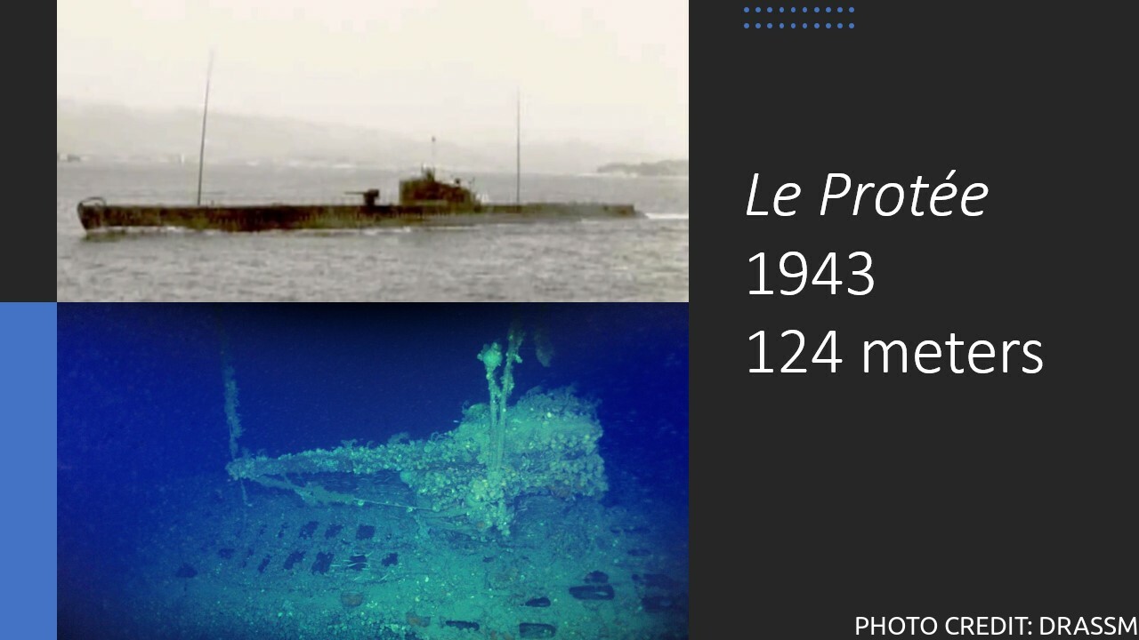 Protée was a French Navy submarine launched in July of 1930. Assigned to the 3rd Submarine Division based in Toulon, it carried out several patrol missions in the Mediterranean during WWII. Protée disappeared in December of 1943, and its wreck was discovered in April 1995 by a Rémora 2000 oceanographic submarine.