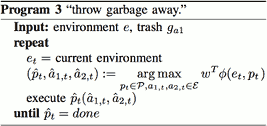Abstract: Many tasks in human environments require performing a sequence of navigation and manipulation steps involving objects. In unstructured human environments, the location and configuration of the objects involved often change in unpredictable ways. This requires a high-level planning strategy that is robust and flexible in an uncertain environment. We propose a novel dynamic planning strategy, which can be trained from a set of example sequences. High level tasks are expressed as a sequence of primitive actions or controllers (with appropriate parameters). Our score function, based on Markov Random Field (MRF), captures the relations between environment, controllers, and their arguments. By expressing the environment using sets of attributes, the approach generalizes well to unseen scenarios. We train the parameters of our MRF using a maximum margin learning method. We provide a detailed empirical validation of our overall framework demonstrating successful plan strategies for a variety of tasks.