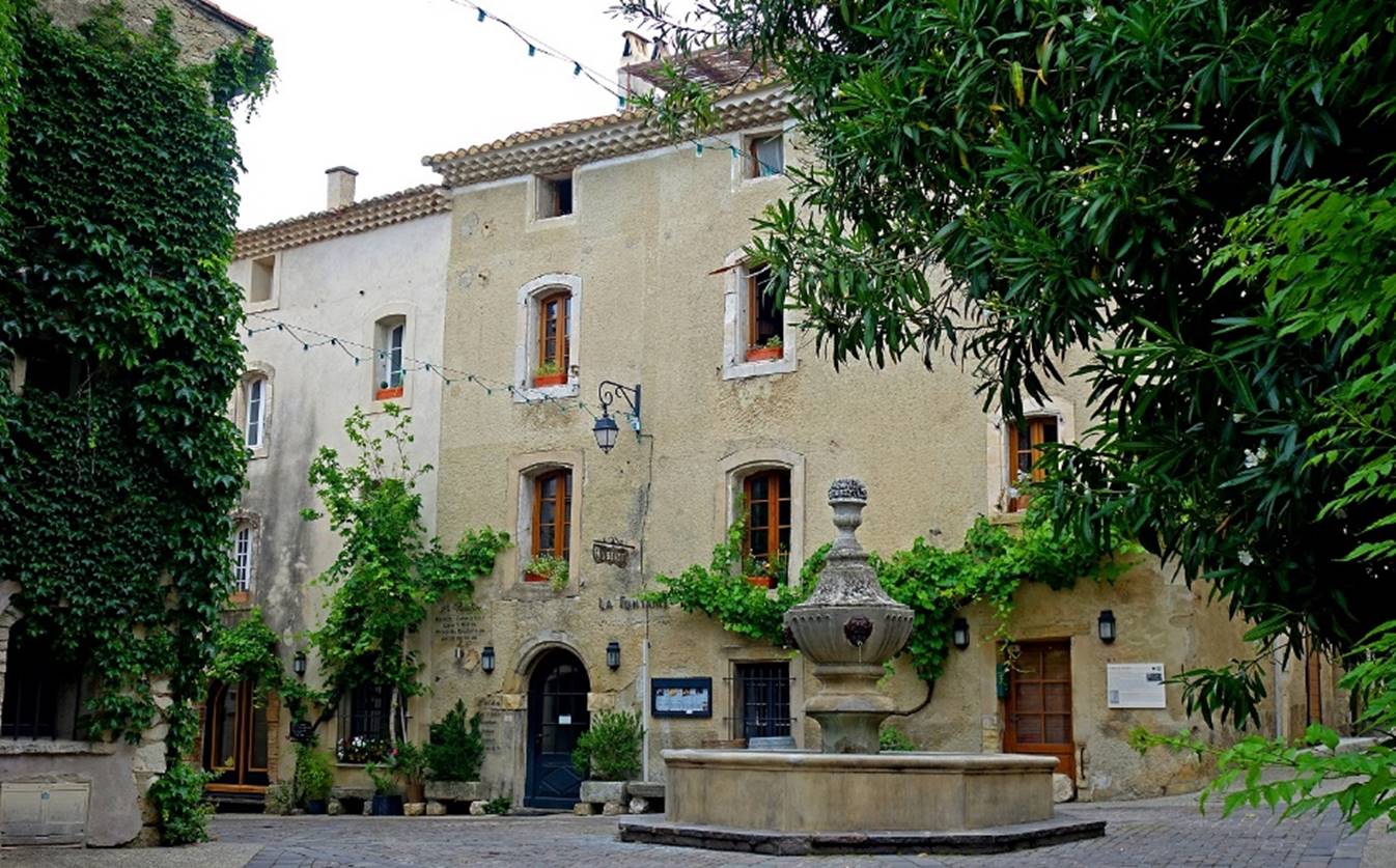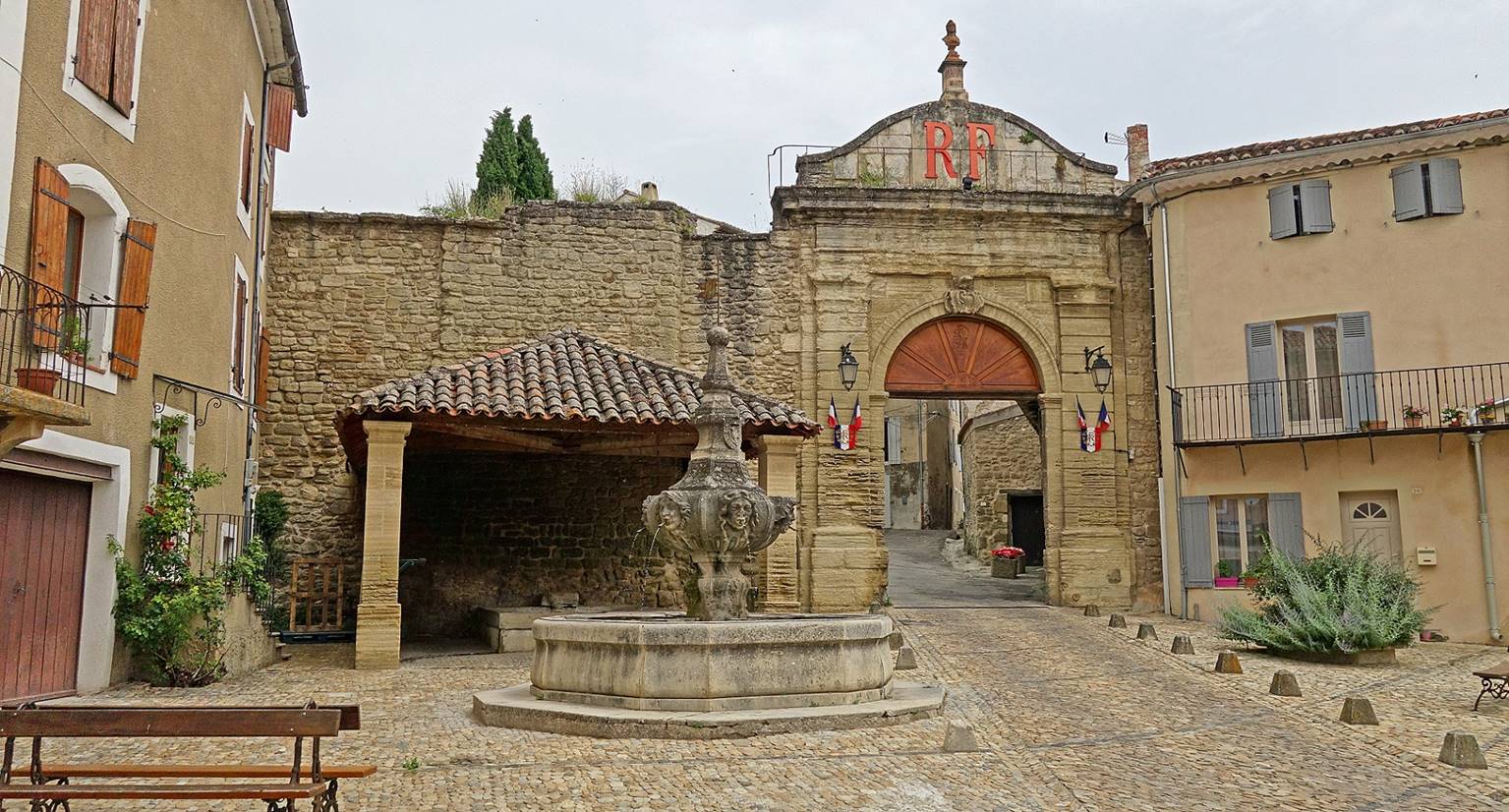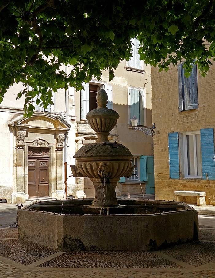 of the village, with a communal wash house and a beautiful fountain equipped with six mascarons on the left.
