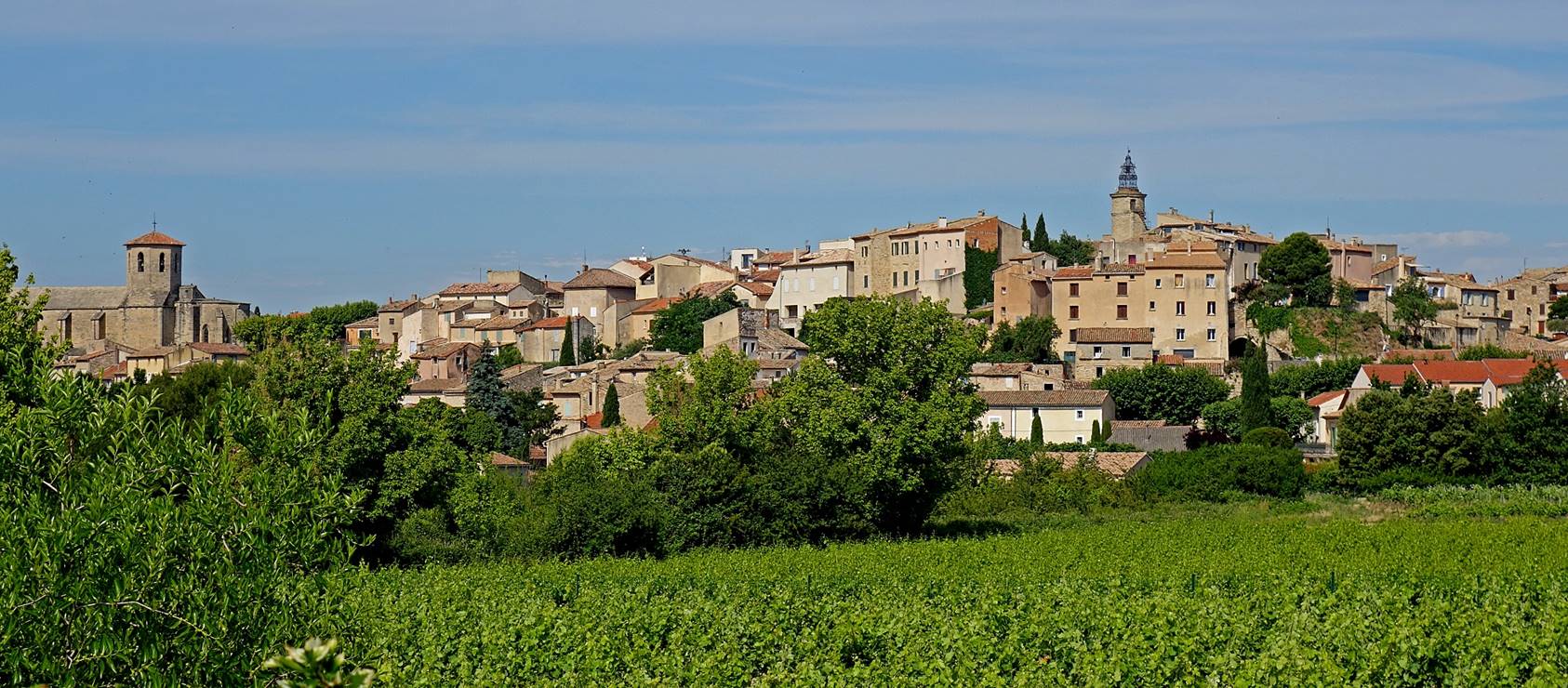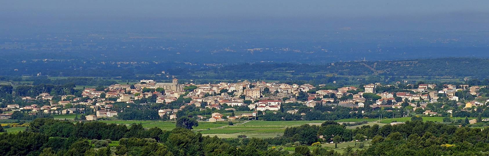 on a low hill that overlooks the Comtat Venaissin plain toward Avignon. It is a