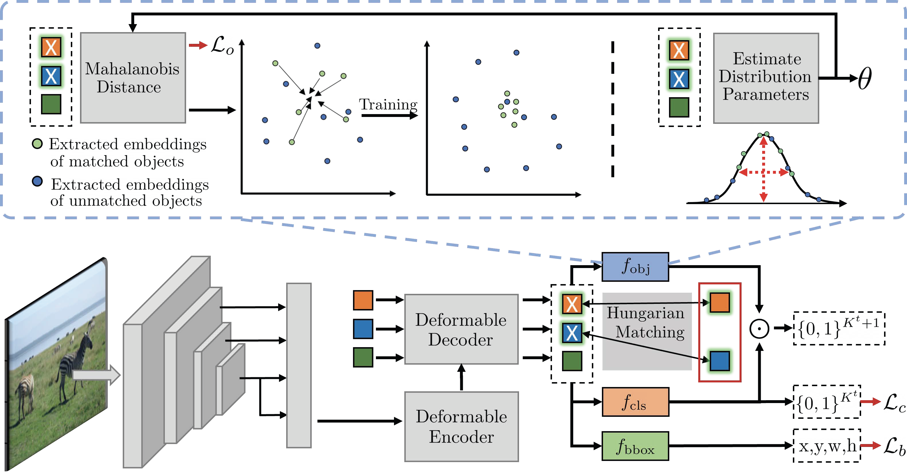 PROB adapts the Deformable DETR model by adding the proposed ‘probabilistic objectness’ head. In training, we alternate between distribution estimation (top right) and objectness likelihood maximization of matched ground-truth objects (top left). For inference, the objectness probability multiplies the classification probabilities. For more, see the manuscript.