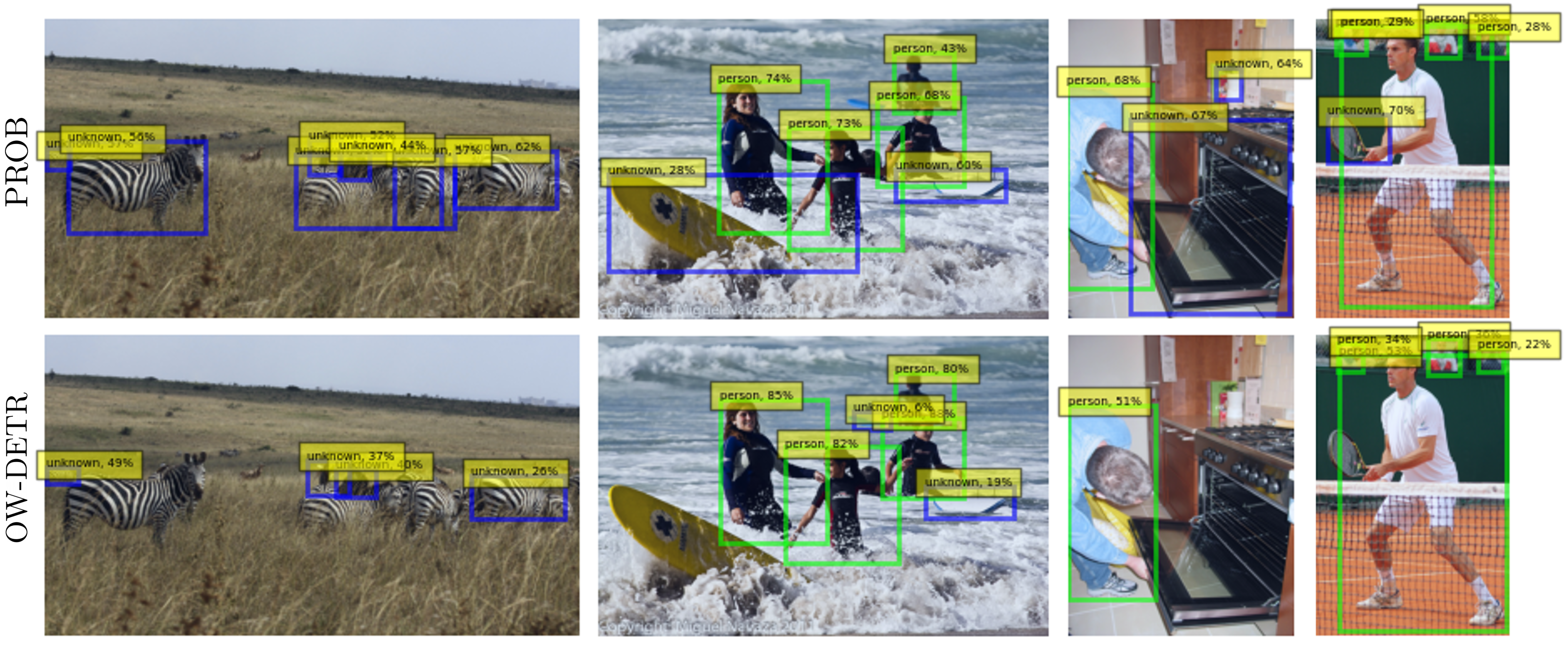 Qualitative results on example images from MS-COCO test set. Detections of PROB (top row) and OW-DETR (bottom row) are displayed, with green - known and blue - unknown object detections. Across all examples, PROB detected more unknown objects than OW-DETR, for example, tennis racket in the right column and zebras in the left column. Interestingly, when OW-DETR does detect unknown objects, the predictions have very low confidence, e.g., the surfing board in the center-left column.